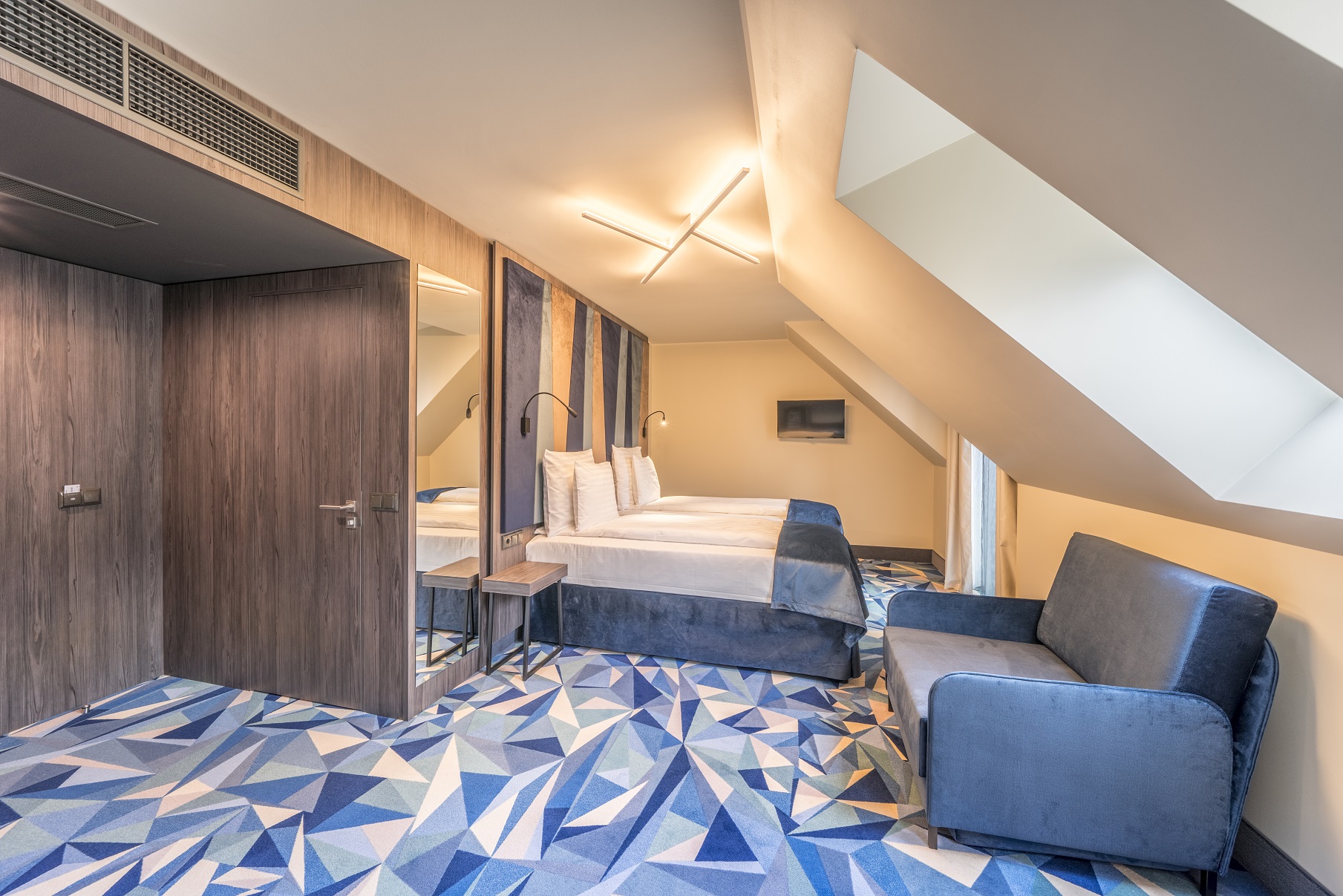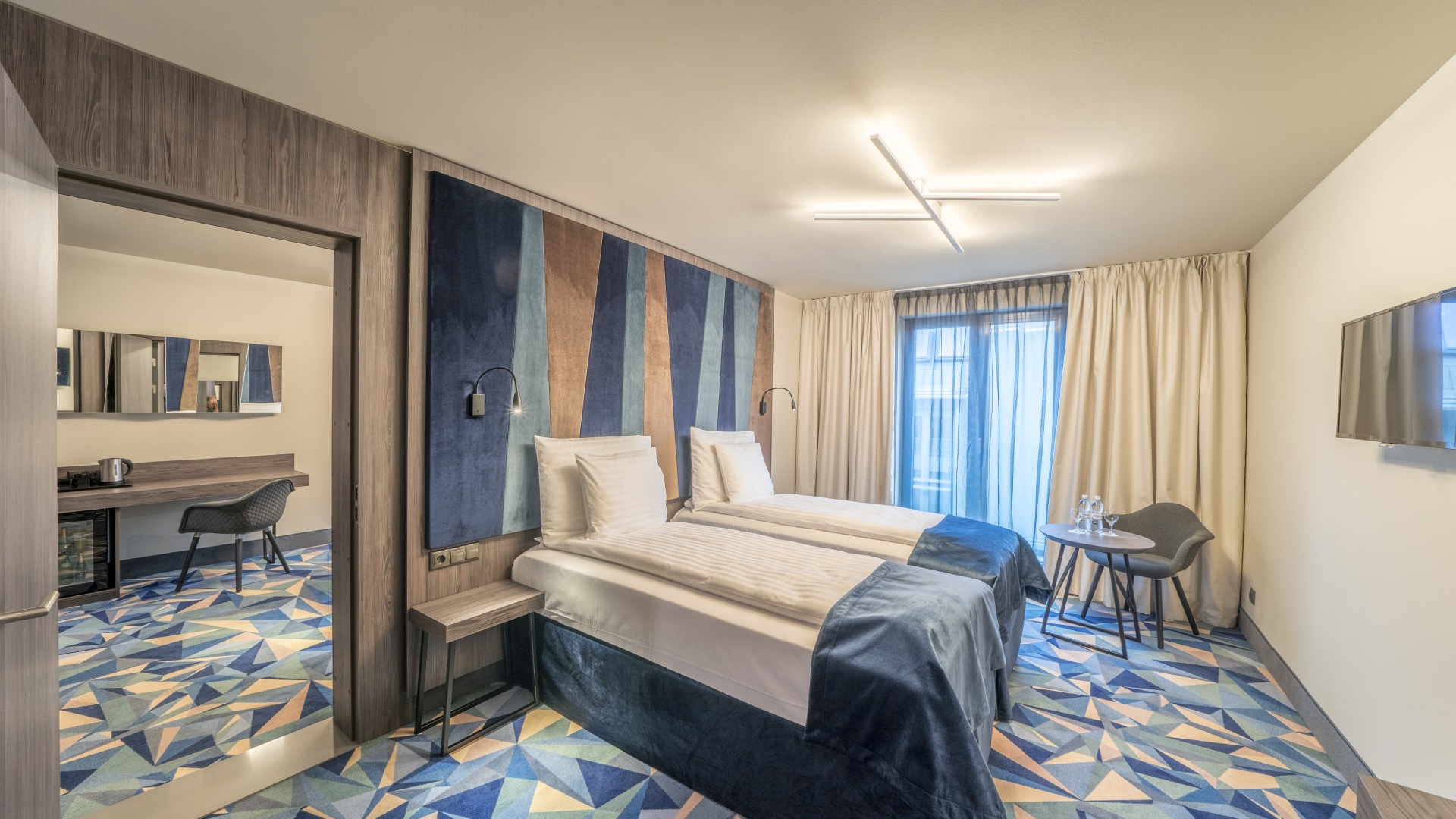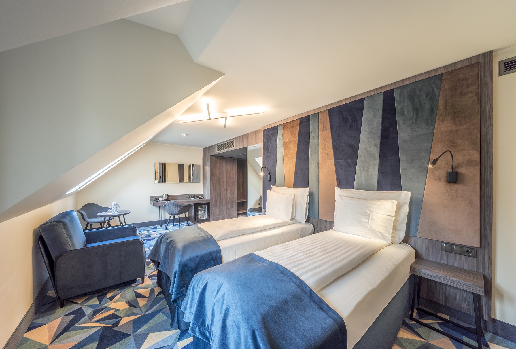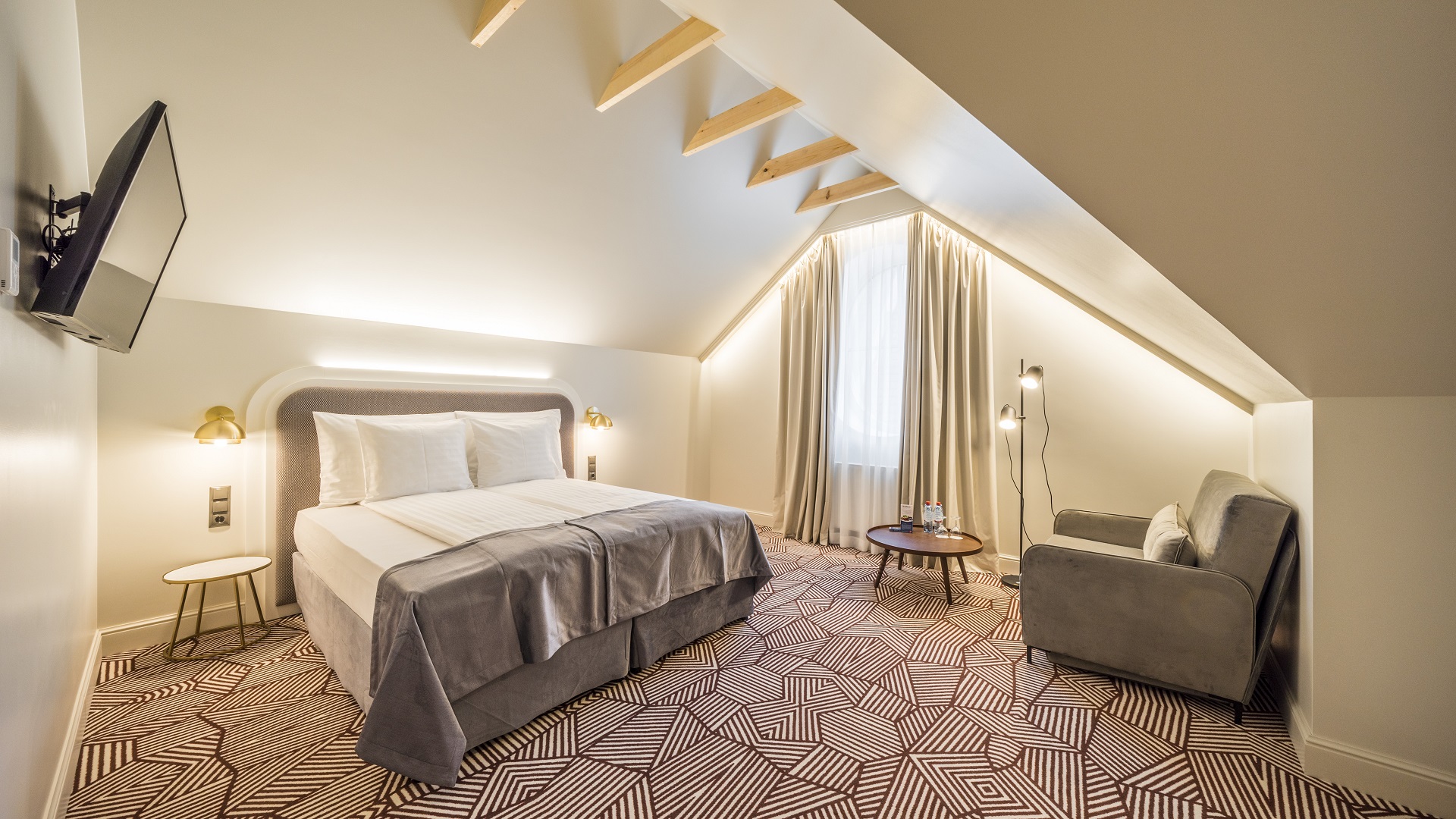 Enjoy wholesome rest in a Riverside Deluxe room with a view of the Daugava.
