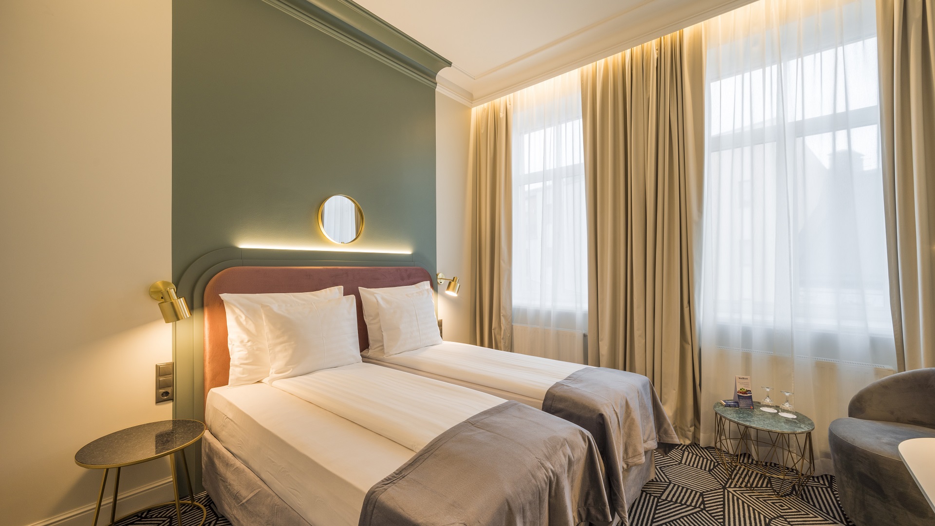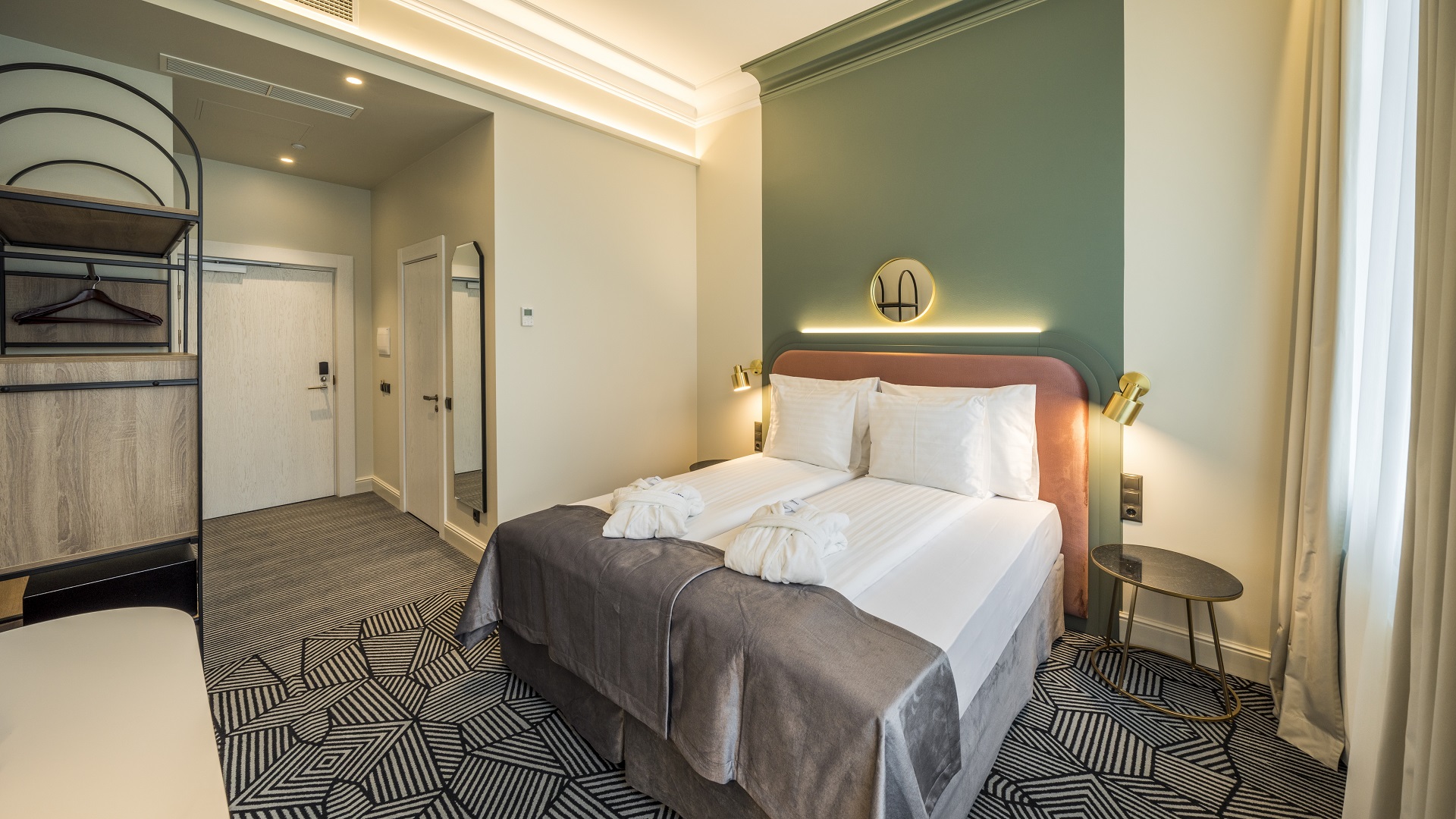 Room with a double or two separate beds, suited for comfortable stays for two people. For guests’ comfort the rooms have bathrooms furnished with a shower or bath, air conditioning, as well as a separate working area and facilities for preparing hot drinks. Free Wi-Fi is available in all Wellton Riverside SPA Hotel guest rooms and public areas. Overnight stays in rooms of this category will be appreciated by all fans of improved comfort! Room size: 21 m².